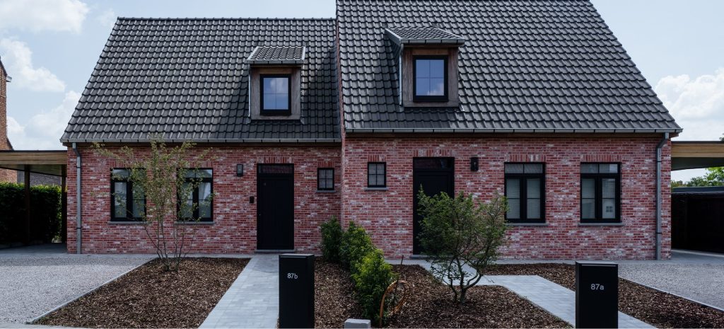Dit project toont een duo moderne maar tijdloze fermettes met een sterke focus op verfijnde raam- en deurdetaillering. De diepgelegen zwarte aluminium raamkaders creëren strakke, elegante lijnen tegen de warme rode gevelsteen.