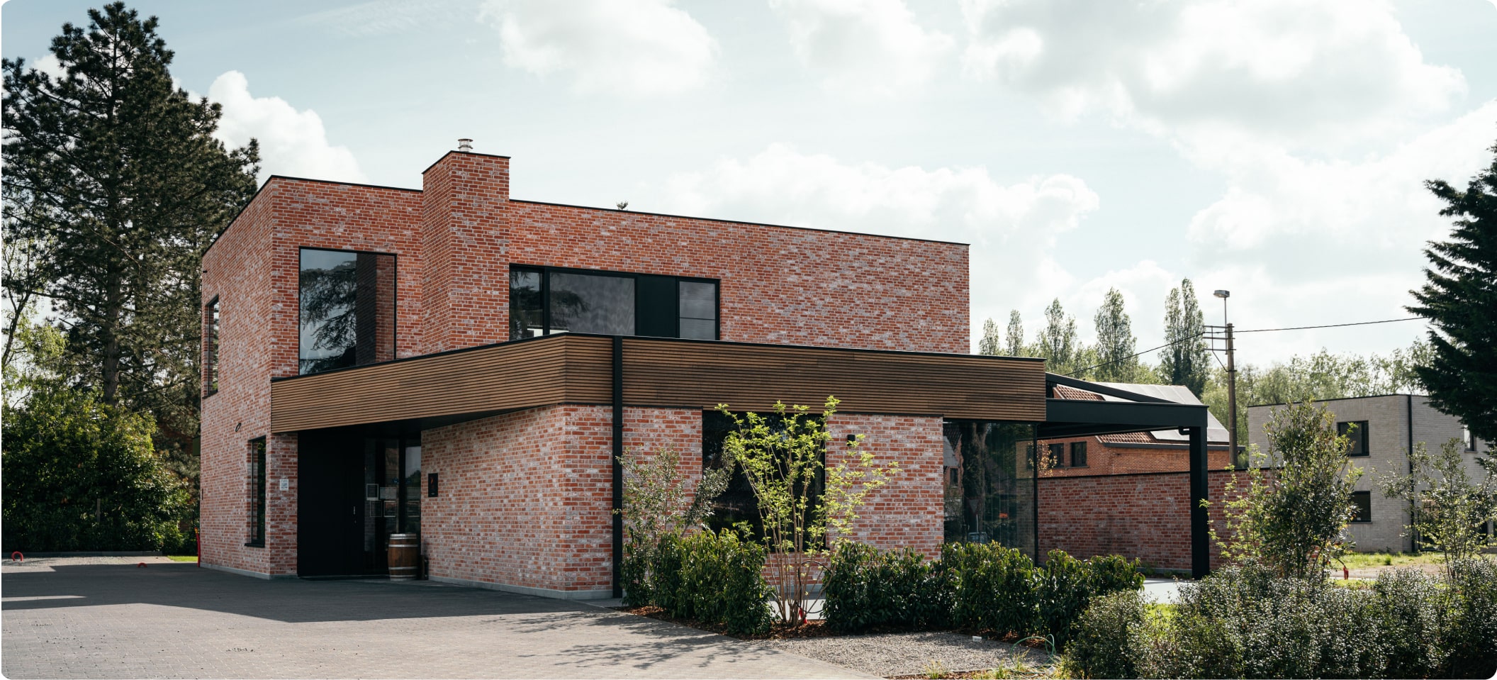 Samen vormen de textuur van de baksteen, de donkere gevelopeningen en de precieze details een harmonieus en architecturaal geheel.